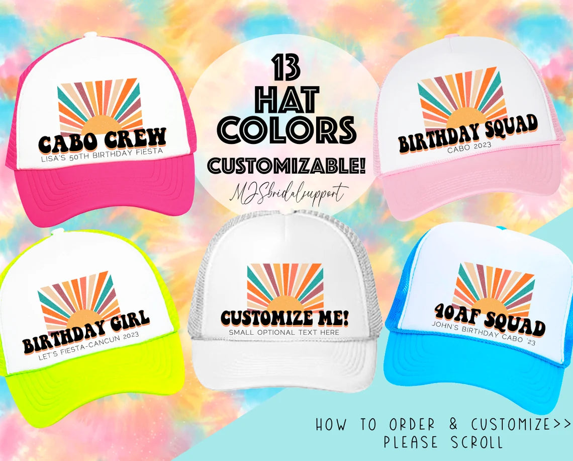 Bring the fun to your next trip or milestone birthday with our retro sunrise trucker hats. Featuring a colorful vintage-inspired sunrise graphic, these hats can be customized with your own text โ Cabo Crew, Birthday Squad, Birthday Girl, 40AF Squad, or anything you dream up.